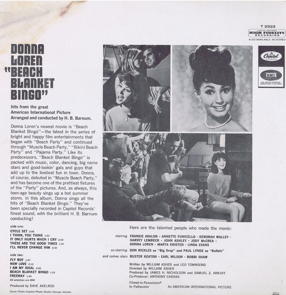 We have a limited inventory of original 1965 copies of "Beach Blanket Bingo". We have both STEREO and MONO versions in various condition. Prices range from $49 to over $100 depending on condition of vinyl, picture sleeve and inner sleeve. Please email us at info@DonnaLoren.net if you have questions.